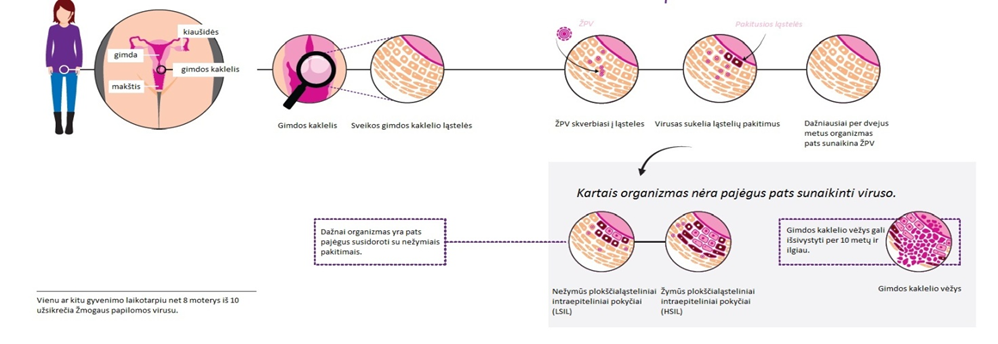 Gimdos kaklelio piktybinis navikas vystosi iš pakitusių gimdos kaklelio gleivinės ląstelių. Tokius pokyčius sukelia aukštos rizikos žmogaus papilomos virusas (arba AR ŽPV). Žmogaus papilomos virusu per gyvenimą užsikrečia net 80 proc. žmonių. Vis dėlto užsikrėtimas šia infekcija dar nereiškia onkologinės ligos diagnozės. Onkologinė liga vystosi, jeigu žmogaus organizmas su šia infekcija negeba kovoti ir infekcija išlieka ilgai. Yra žinoma, kad devynioms iš dešimties ŽPV užsikrėtusių moterų virusas iš organizmo pasišalina per 2 metus, apie 10 proc. atvejų kai kurie ŽPV tipai išlieka ir sukelia ląstelių pokyčius. Iš pradžių ląstelės pakinta ir tampa nenormalios, tačiau jos dar nėra piktybinės. Nediagnozuoti ir negydomi šie pokyčiai progresuoja į gimdos kaklelio piktybinį naviką. Tai gali užtrukti nuo vienų iki dešimties metų ir ilgiau. Rizika, kad infekcija išliks ir vystysis piktybinis navikas, yra didesnė, jei: