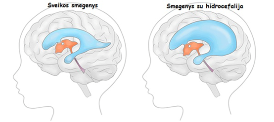 1 pav. Sveikos smegenys ir smegenys su hidrocefalija