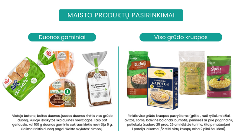 - Rinkitės viso grūdo produktus – duoną, košes, dribsnius, makaronus. Juose daugiau skaidulinių bei mineralinių medžiagų ir vitaminų.